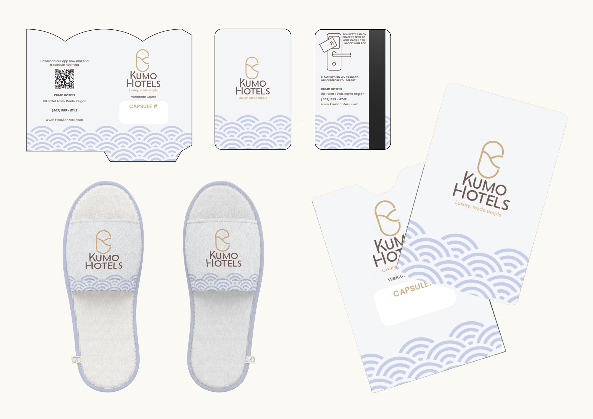 Kumo Hotels required a cohesive brand identity capturing calm, modern luxury within a compact hospitality experience. A minimal visual system was developed using soft forms, restrained typography, and an airy color palette to reflect comfort, efficiency, and tranquility. The resulting brand elevates the capsule hotel concept into a refined and memorable experience.